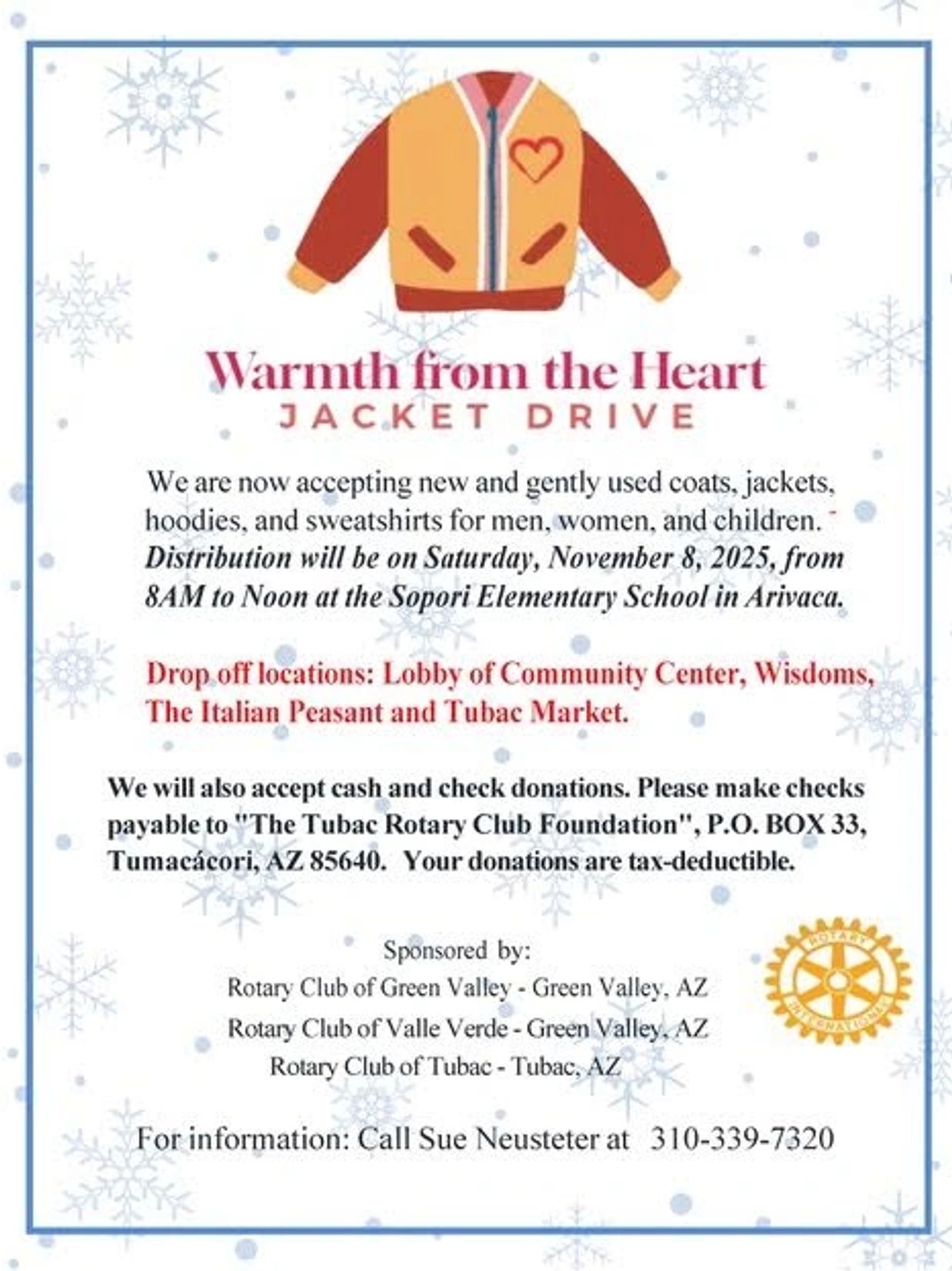 A BIG Thank you to Ned Allen, Andrea Miritello, The Tubac Community Center, The Tubac Nature Center, The Tubac Center of the Arts, as well as all the other wonderful organizations and people in Tubac for your support and with help with the financials costs. You have no doubt made it possible for Tubac residents to have their own local journal.